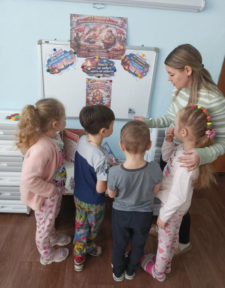 В этот день в группах старшего дошкольного возраста прошли тематические занятия и беседы, в ходе которых дети узнали о блокаде Ленинграда, об условиях жизни ленинградцев в годы блокады, о том, как они выживали, как приспосабливались к условиям постоянного голода и холода. Ребята также узнали о Дороге жизни, и как по ней перевозили грузы и людей.